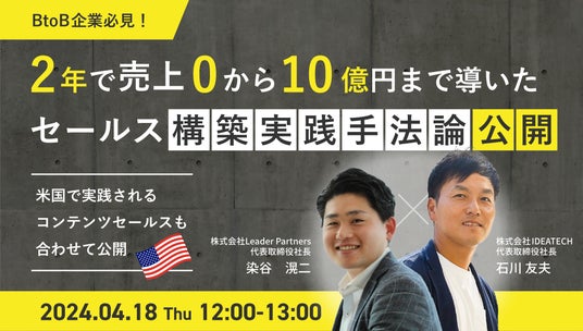 ファクトに基づいたコンテンツ開発とマーケティング支援を行う、株式会社IDEATECH(本社:東京都港区、代表取締役社長:石川友夫)はセールス分野(IDEAセールス事業)にも支援領域を拡げたことを記念して、この度株式会社Leader Partners(本社:東京都渋谷区、代表取締役:染谷滉二)と共同で、2024年4月18日(木)12:00-13:00に「2年で売上0から10億円まで導いたセールス構築実践手法論を公開~米国で実践されるコンテンツセールスも合わせて公開~」と題するオンラインセミナーを開催いたしますので、お知らせいたします。