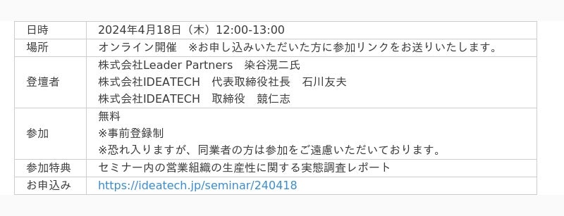 <4/18(木)12:00~13:00>登壇|株式会社Leader Partners 代表取締役 染谷 滉二氏 、株式会社IDEATECH 代表取締役社長 石川 友夫、 取締役 競 仁志