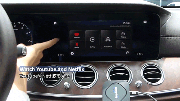 本体をカーナビやモニターに接続すると、YouTubeとNetflixの動画を視聴することができます。また、お好きな音楽や映画を保存したUSBメモリーを本体に差し込めば、USBメモリーに保存した音楽や映画も視聴できます。その他にもワイヤレスApple CarPlayとAndroid Autoの両方対応……