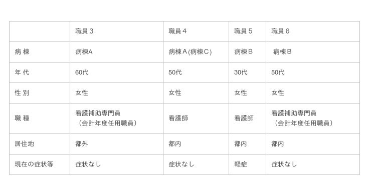 ・本日感染が判明した職員4は、4月1日から他の病棟C(※3)で勤務している。患者の診療や処置を実施する際は、サージカルマスクの着用及び手指消毒等の標準予防策を実施していた。