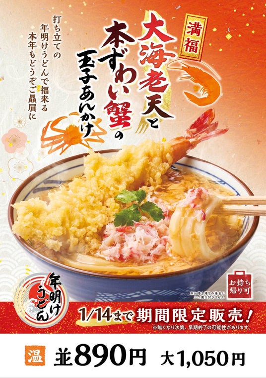 株式会社丸亀製麺(本社:東京都渋谷区、代表取締役社長:山口 寛)が展開する、食の感動体験を追求し、手づくり・できたてにこだわる讃岐うどん専門店「丸亀製麺」は、 2025年1月3日(金)から1月14日(火)までの新春限定で、『大海老天と本ずわい蟹の玉子あんかけうどん』を販売します。2025年の「年明けうどん」は新春にふさわしく、食べ応えのあるぷりっぷりの「大海老天」と濃厚な旨みを楽しめる「本ずわい蟹」が同時に楽しめる贅沢な仕立てに。麺職人※が全店配置されてはじめて迎える新年。おいしさに磨きがかかった打ち立てうどんに、店内で手づくりする熱々の玉子あんかけ、そして贅沢な旨みたっぷりの食材と共にお楽しみいただけます。新年の特別なひとときを彩る「年明けうどん」で、心も身体も温め、すこやかな一年をお過ごしください。