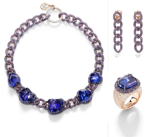 バロックカットの5つのパープルブルータンザナイトは、一見そこにはなにも無いようにデザインされたプロングに抱かれ、チェーンチョーカーと共に揺れ動きます。その色合いは全体を飾るブルーとバイオレットのサファイヤパヴェによってさらに引き立てられています。ストーンそのものを楽しめるフリーフォームのシルエットは、26.86カラットのタンザナイトをダイヤモンド、ブルー、そしてバイオレットのサファイヤパヴェで囲まれたリングにも、反映されています。