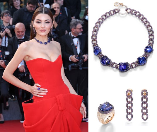 ポメラートの優雅さと洗練されたスタイルを体現する国際的なトップモデルのハンデ・エリチェーレは、5つのパープルブルーのバロックカットタンザナイトが魅惑的な光を放つネックレスをまとい登場しました。ブルーとバイオレットのサファイヤパヴェで全体が覆われ、美しく輝きます。リングは、26.86カラットのタンザナイトをダイヤモンド、ブルー、バイオレットのサファイヤのパヴェが囲んでいます。