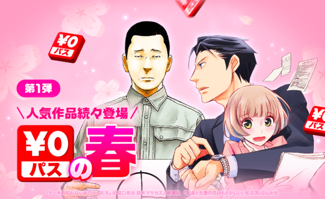 このたび、「¥0パス」対象作品に4週連続で人気作品が続々と登場する「¥0パスの春」大特集を開催します。3月7日(火)より開始した第1弾では、TVドラマ化もされたムズキュンラブストーリー『部長と社畜の恋はもどかしい』(ぶんか社)や、累計60万部突破の新書をマンガ化した『ケーキの切れない非行少年たち』(新潮社)など、人気作品が対象となっています。