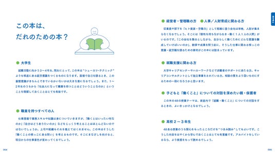 主に大学生・若いビジネスパーソンに向けて書かれていますが、普遍的・根本的な内容を扱っているため、職業を持つすべての人に役立つ書籍です。