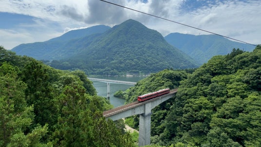 2人の眼前に広がったのは、さっそくの絶景スポット。橋を一望できる沿線屈指の絶景に、友近は思わずパシャリ!雲の白と空の青、緑一面の山々が絶妙に絡んだ美麗ショットを収めた。
