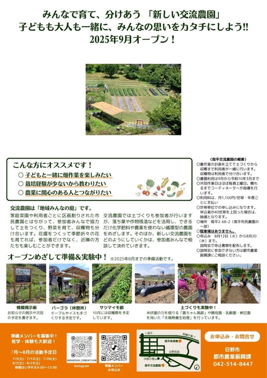 利用者が一緒に農作業を行いながら交流する新しいタイプの農園「南平交流農園」を日野市が9月に開園します。併せて利用希望者向けの説明会を開催します。