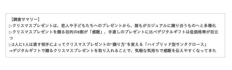 アンケートの結果、クリスマスは恋人や家族のための特別なイベントとしてだけではなく、友人や仲間同士など多くの人々に楽しまれるイベントとしても活用されていることがわかりました。また、クリスマスプレゼントは「愛を伝えるもの」という意味よりも「感謝を伝えるため」に贈られる傾向が高いことも判明し、クリスマスプレゼントをデジタルギフトで贈ることで、より気軽に感謝を伝えやすくなってきていると思われます。今年のクリスマスは、限られた人だけがクリスマスプレゼントを贈り合う特別なものとしてではなく、「ハイブリッド型サンタクロース」のように、デジタルギフトを活用しながら、気軽にクリスマスを楽しむ人が増えることが予想されます。