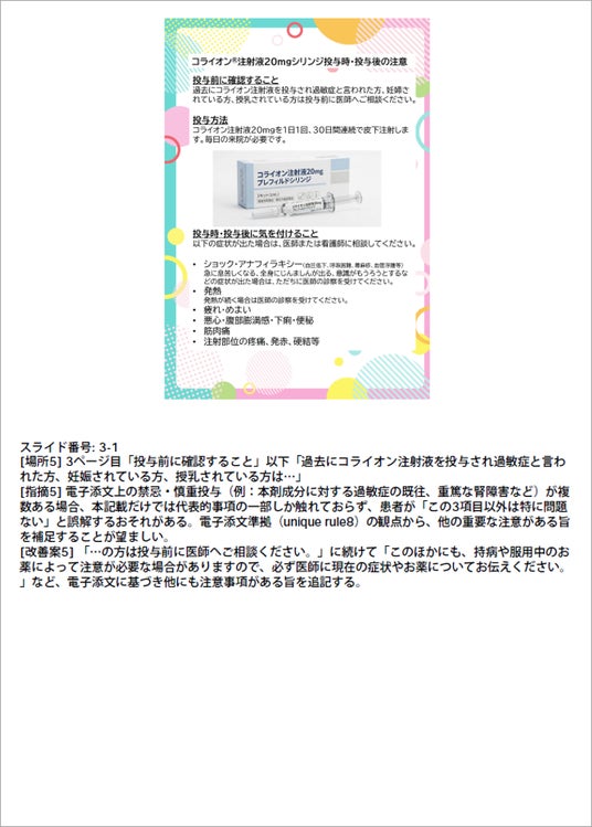 [指摘1] unique ruleの8に違反しています。電子添文の「8.1」には副作用として発熱が高頻度に認められる旨の記載はありますが、「37度以上」という具体的な基準値の記載はなく、電子添文の内容から逸脱しています。