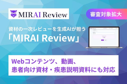 業務支援AIソリューションを展開する木村情報技術株式会社(本社:佐賀県佐賀市、代表取締役:木村 隆夫、以下「木村情報技術」)は、製薬企業向け資材一次レビューAIサービス『MIRAI Review(ミライレビュー)』において、一次レビュー(審査)の対象範囲を拡大し、新たにWebコンテンツ、動画、疾患解説・患者向け資材に対応したことをお知らせします。