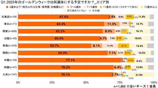 エリア別に休暇日数を見ると、東海エリアでは「7~9連休」を取得予定する人が11.9%となり、他エリアに比べやや休暇日数が長いようです。