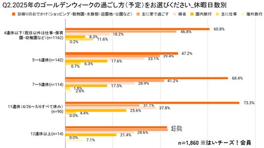 休暇日数別でみると、4連休以下の層では「日帰りのおでかけ」が60.8%、「主に家で過ごす」が46.8%と近場で手軽に楽しめる過ごし方が中心となる一方、11連休以上の長期休暇を取得する層でも「日帰りのおでかけ」が73.3%と高く、遠方への旅行よりも近場でのレジャーを重視する傾向が見られました。