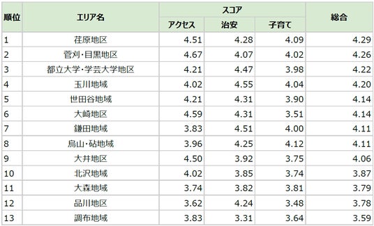 対象地域の653名を対象にしたアンケートより、アクセス、治安、子育ての3つの評価スコアから総合スコアを算出し、ランキング化。