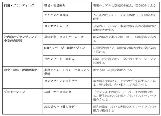 企業活動において、現場を動かすためには様々なコミュニケーションが必要です。以下のような場面で動画を効果的に活用することで、正確で心に響くメッセージの発信や共感による一体感を醸成することが可能です。