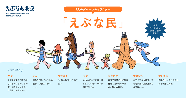 今回公開されたサイト「えぶなみ北泉」では東日本大震災から12年が経つ今年、さらに多くのサーファーの方が北泉を訪れることを目的に、最新情報やイベント告知などを発信していきます。さらに人気イラストレーターの中島ミドリさんに書き起こしていただいた北泉海岸のオリジナルキャラクター「えぶな民(えぶなみん)」も誕生。全国のサーファーの皆さまに楽しんでいただけるようなコンテンツあふれるサイトですので、ぜひご覧ください。
