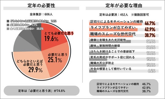 回答者全体の606人に定年の必要性を聞くと、「必要だと思う派」が74.6%で過半数を占め、内訳は「とても必要だと思う」19.6%、「必要だと思う」25.1%、「どちらかといえば必要だと思う」29.9%でした。定年は必要と回答した452人にその理由を聞くと、「区切りによるモチベーションの維持」が46.7%で最多となり、次いで「ライフプランが立てやすい」が42.9%、「職場のスムーズな世代交代」が38.7%でした。