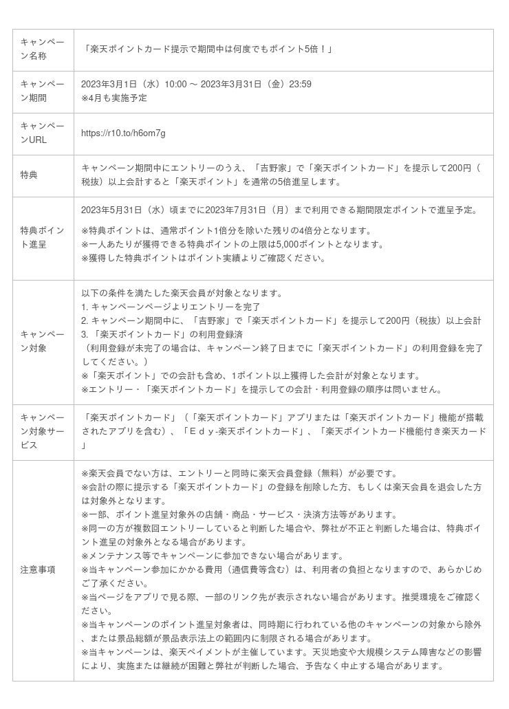 - さらに「吉野家」では「楽天ポイント」5倍キャンペーンも開催中 -