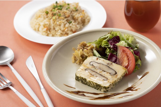 美しい白薩摩"白もん"のお皿に盛りつけた、日置市の食材を使用したセットメニュー。「日置の鯛と筍と椎茸の温テリーヌ」や、「日置のちりめんじゃこピラフ」など、料理を彩る薩摩焼の魅力と日置市の食を堪能する一品です。