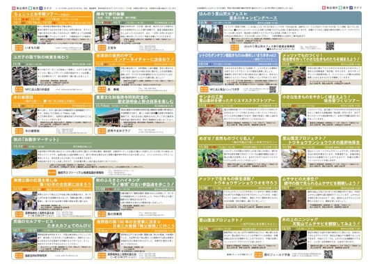 「飯能エコツアー 2024.秋冬号」では、2024年11月から12月に実施されるツアーを紹介しています。秋から初冬の飯能の自然や味覚を感じることができるツアーや、11月17日(日)に開催される飯能の里山が満喫できる「秋のお散歩マーケット」、お正月を前に地元の自然の素材を使ったしめ飾りや門松を作るツアーなど多数のツアーを企画しています。