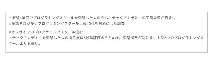 ユナイテッド株式会社(本社:東京都渋谷区、代表取締役社長 兼 執行役員:早川 与規、証券コード:2497)の連結子会社である、キラメックス株式会社(本社:東京都渋谷区、代表取締役社長:樋口 隆広、以下「当社」)が運営するオンラインプログラミングスクール「テックアカデミー」は、GMOリサーチ株式会社をアンケートモニター提供元とする「プログラミングスクールに関する調査」の結果、直近1年間での受講者数No.1を獲得いたしました。本調査は受講者数が多いプログラミングスクール上位13社を対象にした調査結果を元に作成したものです。