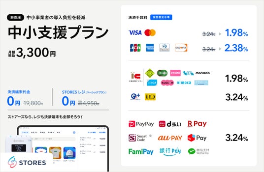関連リリース:STORES 決済、クレジットカード決済手数料を業界最安水準1.98%に引き下げ、中小事業者向け「中小支援プラン」を新たに提供
