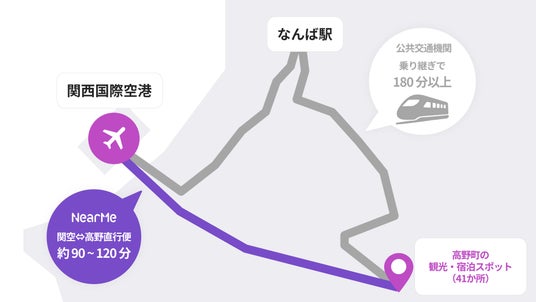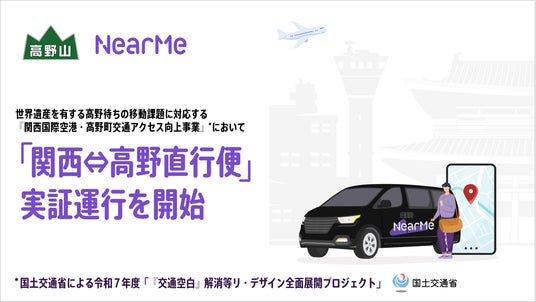 移動に関する課題解決に取り組むソーシャルデザインカンパニーである株式会社NearMe(本社:東京都中央区、代表取締役社長:高原幸一郎、以下「ニアミー」)は、高野山タクシー株式会社(本社:和歌山県伊都郡高野町、代表取締役社長:豊田英三)が運行主体となり実施する『関西国際空港・高野町交通アクセス向上事業』において、関西国際空港と和歌山県屈指の観光地である高野町を直接結ぶ「関西⇔高野直行便」の実証運行を開始します。また、本実証運行の開始に伴い、本日よりニアミーアプリからの予約受付を開始いたします。