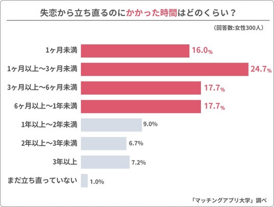 一方で、「1年以上立ち直ることができなかった」人も22.9%と、失恋の痛手が長引くケースも少なくありません。
