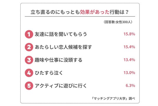 300人の失恋経験者の皆さんに、失恋から立ち直るために取った行動を聞いてみました。結果は次の通り。