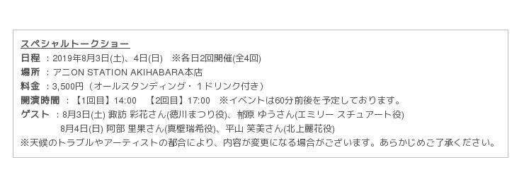 さらに、8月3日(土)、4日(日)は、徳川まつり(とくがわまつり)役の諏訪彩花(すわあやか)さん、エミリー スチュアート役の郁原ゆう(かはらゆう)さん、真壁瑞希(まかべみずき)役の阿部里果(あべりか)さん、北上麗花(きたかみれいか)役の平山笑美(ひらやまえみ)さんら声優キャストをゲストにお招きし、AKIHABARA本店にてトークショーを開催します。