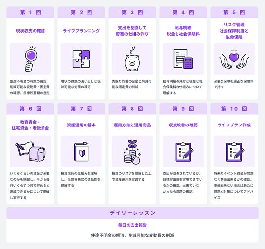 各レッスンは完全マンツーマンで行われ、個々のニーズに合わせカスタマイズされたアドバイスを提供します。さらに、毎日の支出報告をもらいながら家計改善を並走することで、カリキュラムで得た知識の実践や浪費癖の解消、貯蓄習慣の形成までサポートします。