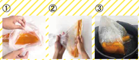 3.お鍋でお湯を沸かし、沸騰後、2.をポリ袋ごと入れて10分湯煎する