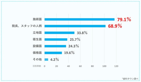 口コミを参考にしたことがある患者さんのうち、約8割は治療に関わる「施術面」を、約7割は「院長、スタッフの人柄」を参考にしているとわかりました。多くの患者さんは歯医者さん選びにおいて、医療の質とともに院長やスタッフの対応を重視していると考えられます。