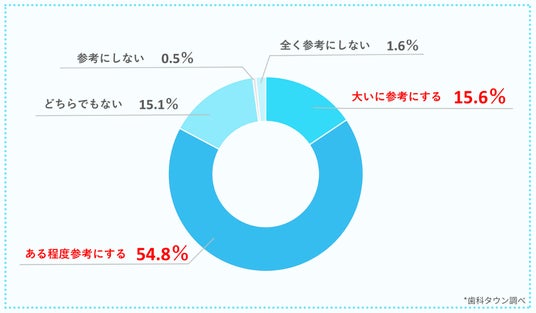 しかし、口コミを参考にしていない人も34.5%存在し、全体の約1/3の人は口コミ以外の情報源を利用していることがわかります。この結果からは、口コミを頼らずに知人や家族からの紹介、歯医者さんのホームページなどを頼りにしている方も一定数いると考えられます。
