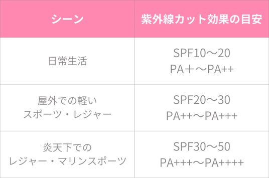 使用シーンごとのSPF・PA値の目安は以下を参考にしてください。