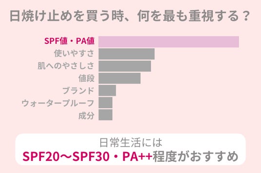 調査の結果、日焼け止めを購入する際、最も多くの方が「SPF値・PA値」を重視することがわかりました。
