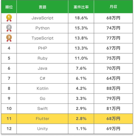 Flutterは比較的新しい技術のため、JavaScriptやPHPといった定番言語と比べると案件数は限られます。ただし、クロスプラットフォーム開発の需要増加に伴い、案件数は年々増加傾向にあります。