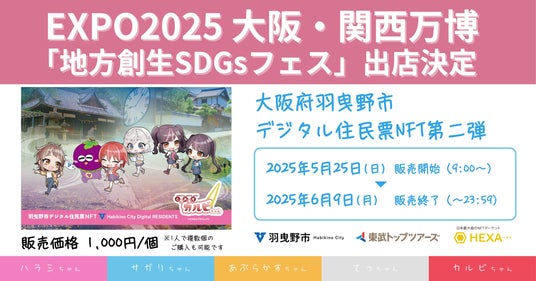 日本最大級のNFTマーケット「HEXA(ヘキサ)」を運営するメディアエクイティ株式会社(代表取締役:椛島 誠一郎)は、東武トップツアーズ株式会社(社長執行役員:百木田 康二)と連携し、大阪府羽曳野市(市長:山入端 創)のデジタル住民票NFT第二弾をEXPO2025 大阪・関西万博「地方創生SDGsフェス」で販売します。