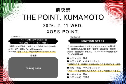 THE POINT. KUMAMOTOの前夜祭として、2月11日(水)XOSS POINT.にて2つのコンテンツを開催します。熊本市がこれまで耕してきた”挑戦を生み出す土壌”を背景に、次世代の挑戦者や九州から世界を見据える支援者が一堂に会する特別企画が実現します。