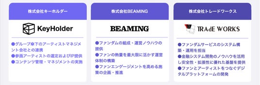 当社は、2023年10月17日付け「当社及び株式会社KeyHolder並びに株式会社トレードワークスとのファンダム立ち上げに関する業務提携契約締結に関するお知らせ」のとおり、乃木坂46 、SKE48、Novelbrightなどの著名アーティストの運営会社を傘下に持ち、秋元康氏も特別顧問を務める「株式会社KeyHolder(本社:東京都渋谷区、代表取締役社長:大出悠史、以下「KeyHolder」という)」ならびに、金融システム開発サービスやECプラットフォームなどのシステム開発を展開する株式会社トレードワークス(本社:東京都港区、代表取締役社長:齋藤 正勝、以下「トレードワークス」という)の3社で、「ファンダム(※)」企画の立ち上げに向けた業務提携契約を締結し、協業当初より戦略立案・準備を行ってまいりました。