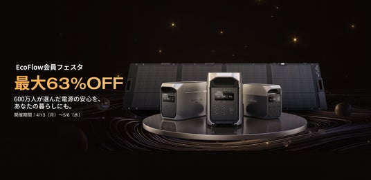 ポータブル電源およびクリーンエネルギー技術のリーディングカンパニーであるEcoFlow Technology Japan株式会社(本社:東京都中央区、以下EcoFlow)は、2026年4月13日(月)から5月6日(水)までの期間、日頃のご愛顧に感謝を込めた「EcoFlow 会員フェスタ」を開催いたします。世界中のユーザーと共に歩んできたEcoFlowが、より多くの方へ「電気があることの安心」を届けるための特別な期間となります。