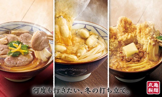 いよいよ、冬本番。丸亀製麺では最初のひと口から最後のひと口まで心地よくあたたかいうどんを豊富にご用意しています。麺職人※が全店配置され、おいしさに磨きがかかった打ち立て、茹でたてのうどんに、冬の旨みが溶けだした、あつあつのだしをたっぷりとからめてお召しあがりください。