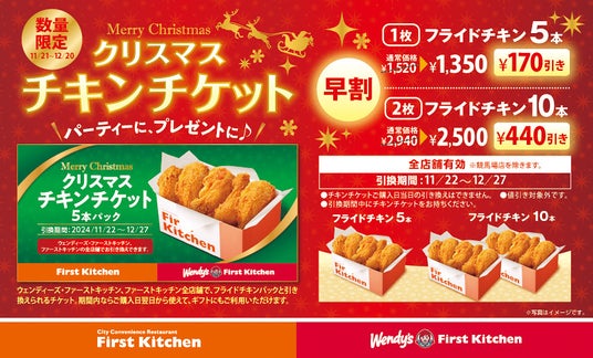 ウェンディーズ・ジャパン株式会社及び、ファーストキッチン株式会社 (所在地:東京都新宿区、代表取締役:紫関修) では11月21日(木)から、ウェンディーズ・ファーストキッチンとファーストキッチン(競馬場店を除く)にて、11月21日(木)~12月20日(金)の期間中、「クリスマスチキンチケット」を販売します。外はサクッと中はふっくらジューシーな自慢のフライドチキンを、通常価格より5本パックは170円引き、10本パックは440円引きと“早割”ならではのお得な内容でご用意しております。引換はご購入日翌日より可能で、引換期間は11月22日(金)~12月27日(金)までと期間を幅広く設けさせていただいておりますので、クリスマスシーズンはもちろん、年末にご家族などお家で集まるさまざまなシーンでご利用いただけます。是非お近くのウェンディーズ・ファーストキッチンまたはファーストキッチンでお買い求めください。