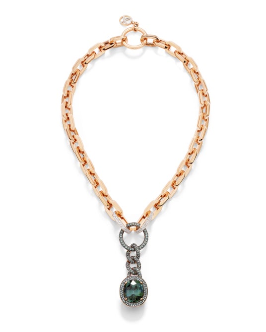 ローズゴールドチェーンがグレーサファイヤパヴェのほどこされたグルメチェーンにつながっています。チェーンは中央のグレーサファイヤ輝くゴールドサークルを通して一つになり、20.72カラットのグレーグリーントルマリンはペンダントのように優雅に垂れ下がります。
