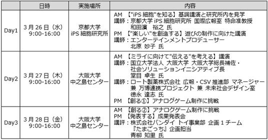 本ワークショップは、大阪・関西万博「TEAM EXPO 2025」プログラムの共創パートナーであるKCJ GROUPが、企業や自治体、教育機関と連携した活動(※)の1つとして、大阪・関西万博のテーマ「いのち輝く未来社会のデザイン」に基づき企画し、上述の2大学機関と共同で実施するものです。参加者は、科学をわかりやすく伝える「サイエンスコミュニケーター」として、再生医療を実現するために重要な役割を果たすことが期待されているiPS細胞をテーマにしたアナログゲームを3日間で制作します。