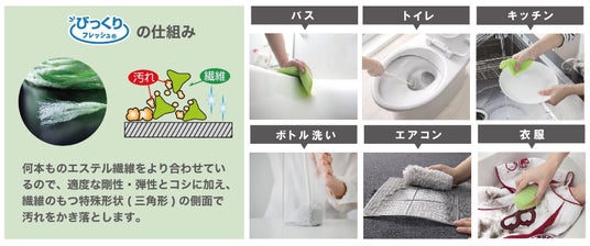 ・不織布部分には特殊形状の繊維を使用しているので、水だけでも汚れをかき落とします。