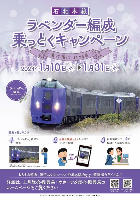 オホーツク総合振興局と管内JR石北線沿線自治体※では、JR北海道の特急車両ラベンダー編成が石北本線を運行する1月10日(水)から1月31日(水)の期間中、鉄道の利用促進と沿線市町の活性化を目的として、JR北海道などの協力のもとキャンペーンを実施しています。