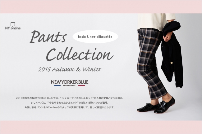“気分にまかせ、お気に入りを身にまとう” をコンセプトに、遊び心のあるトラッドカジュアルスタイルを提案する NEWYORKER BLUE。2015年秋の新作商品から、「ジャストサイズのシルエット」が人気の定番パンツに加え、新たに「ゆとりをもったシルエット」の新シルエットパンツが登場しました。公式オンラインショップ NY.onlineでは、新作パンツを詳しくご紹介するコンテンツページ「パンツコレクション」を公開。ヒップラインなどジャストなサイズ感で美しいシルエットが魅力の定番パンツに加え、新たにゆったりと穿けるリラックス感が魅力の新シルエットパンツが新登場。それぞれのシルエットパンツを実際にスタッフが着用したコメント紹介や、NEWYORKER BLUE 2015秋冬のラインナップからお勧めのパンツとコーディネーションをご紹介しております。パンツスタイルの参考に、ご自分にぴったりのシルエットパンツを見つけてください。