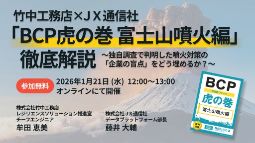 本ウェビナーでは、建物のプロである竹中工務店と、リスク情報のプロであるJX通信社、両社の知見をまとめた特別資料「BCP虎の巻 富士山噴火編」を徹底解説します。