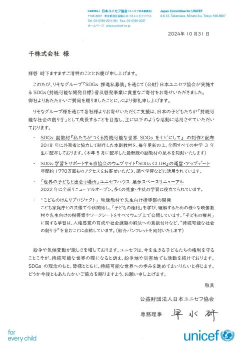 (「公益財団法人日本ユニセフ協会」様からの感謝状)