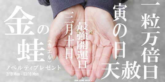 JAMHOMEMADEでは最強開運日に合わせて、開運チャーム“金の蛙”ノベルティプレゼントフェアを開催しています。3月10日、2025年最初の最強開運日に向けて開催予定です。数に限りがございますのであらかじめご了承ください。